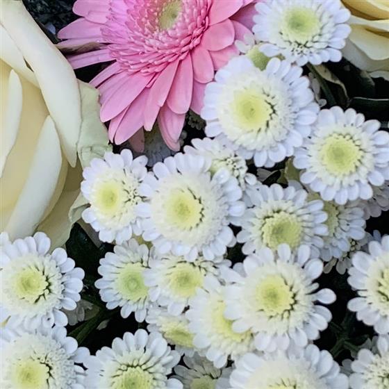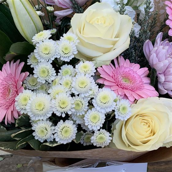 A popular bouquet with a collection of blooms in shades of pink and white, hand-tied and delivered in a gift bag.