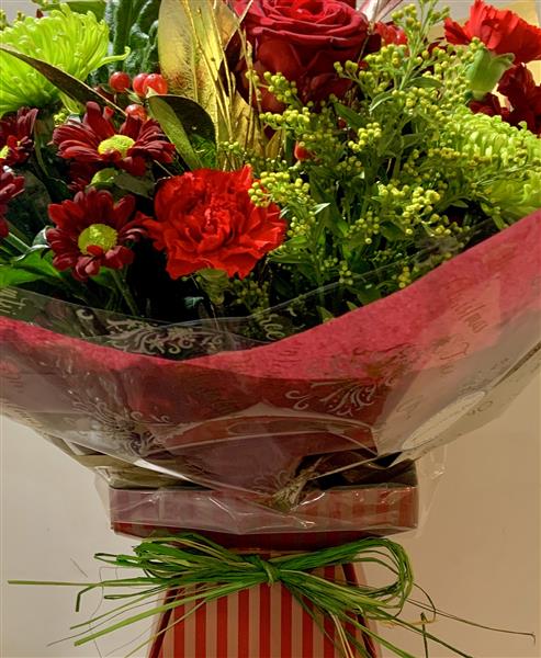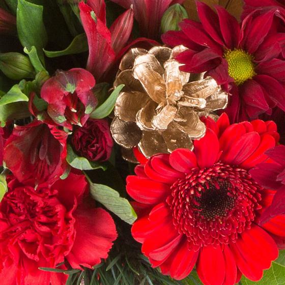 A popular, traditional Christmas bouquet in red, gold and green. Beautifully presented in a stylish aqua box.