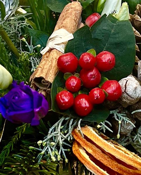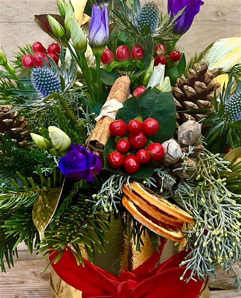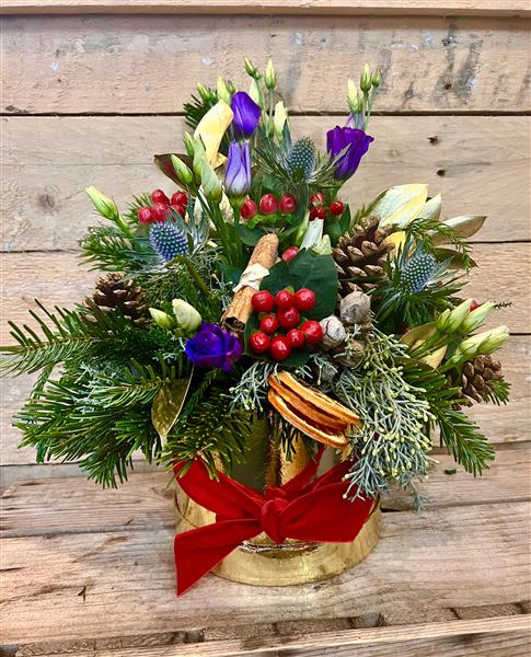 Festive flowers and foliage with aromatic fruits arranged in a hatbox in sparkling red, gold or silver.