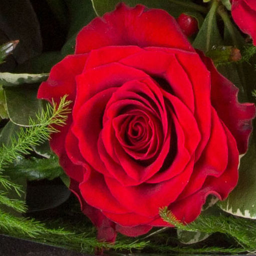 12 long stemmed velvety red roses mingled with foliage and hypericum berries, presented with kraft paper and delivered in an aqua packed box.
