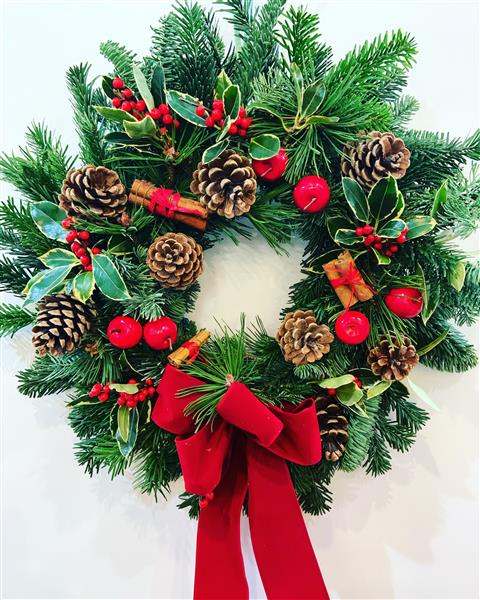 Festive 18” Door Wreath with seasonal foliage, red velvet bow, cinnamon sticks and berries.