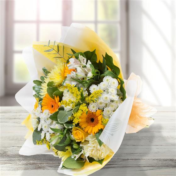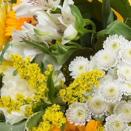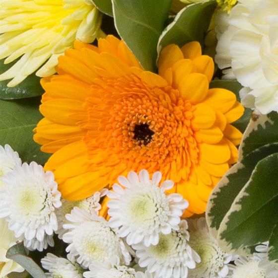 A hand-tied bouquet of gold and white blooms including gerberas, chrysanthemums, carnations.