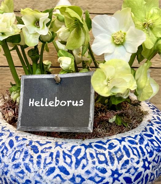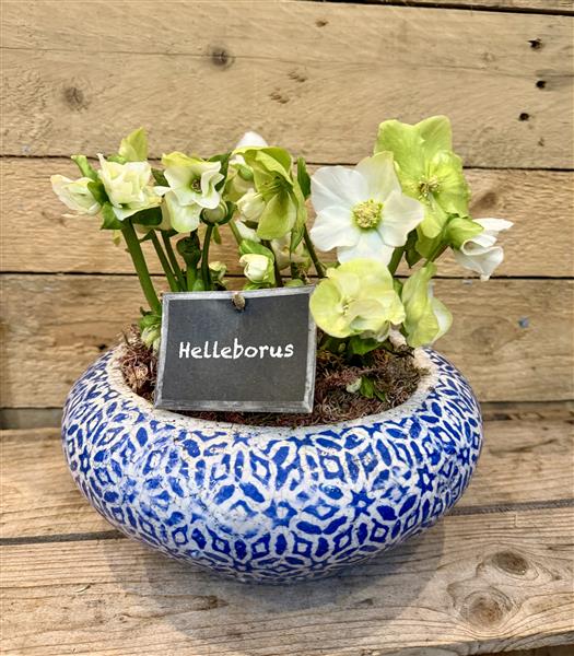 Stunning, vintage stone pot filled with beautiful hellebore plants.