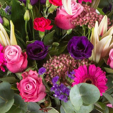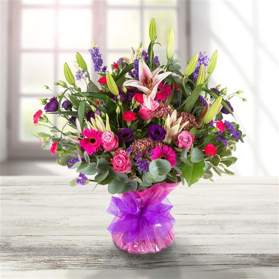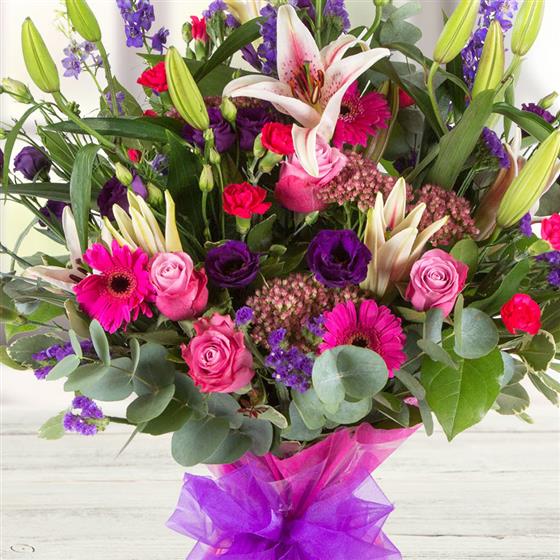 A bold, beautiful bouquet in shades of pink and purple including lilies and roses. . A real show stopper!