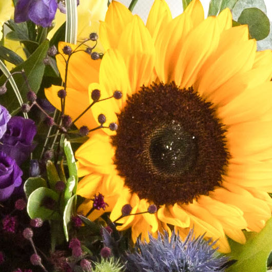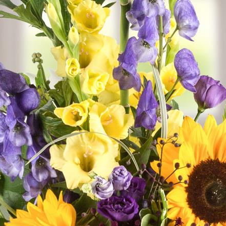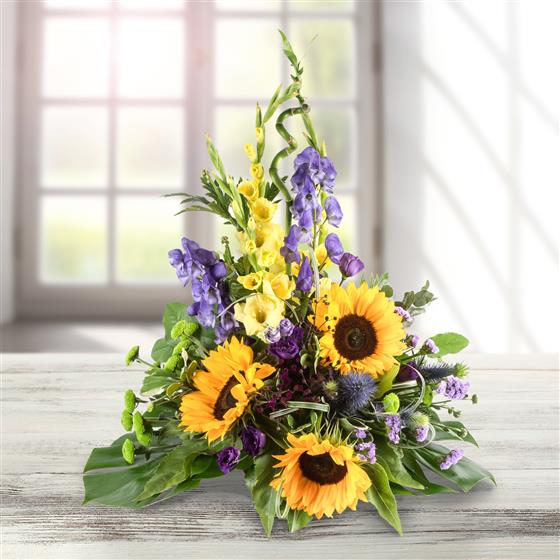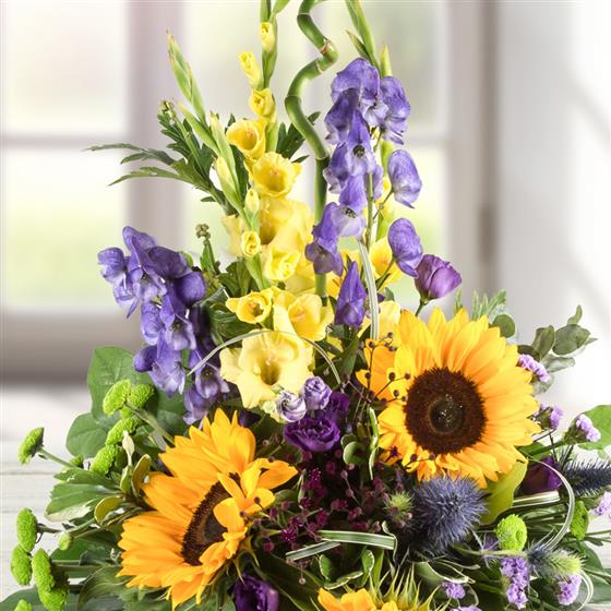 A magnificent arrangement of bright yellow sunflowers complemented with purple and lime. Flowers are arranged in a low dish, easy to care for and ready to adorn any table
