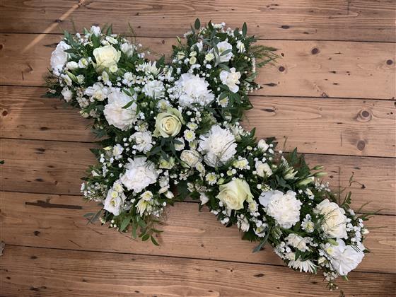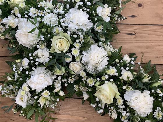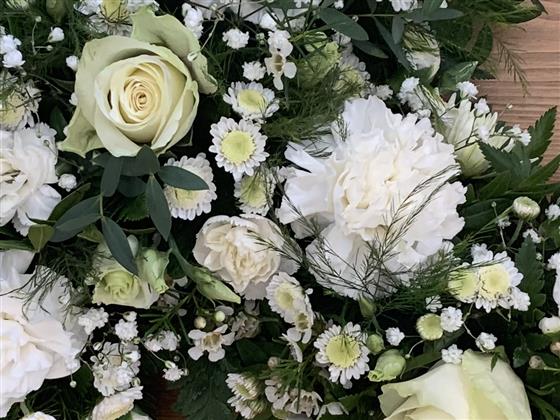 Mixed loosely arranged flowers in white and green. Standard price is 2ft size.