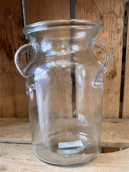Sturdy glass vase in a milk churn design. 20cm high