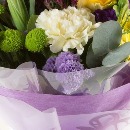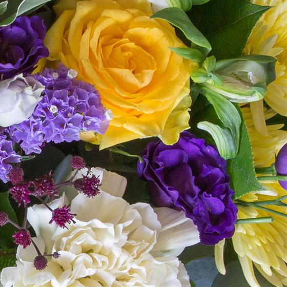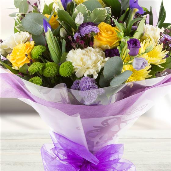 Glorious purples, yellows and limes including roses, lisianthus and thistles combine together to create a striking hand-tied bouquet.