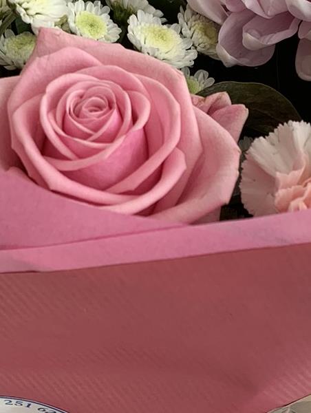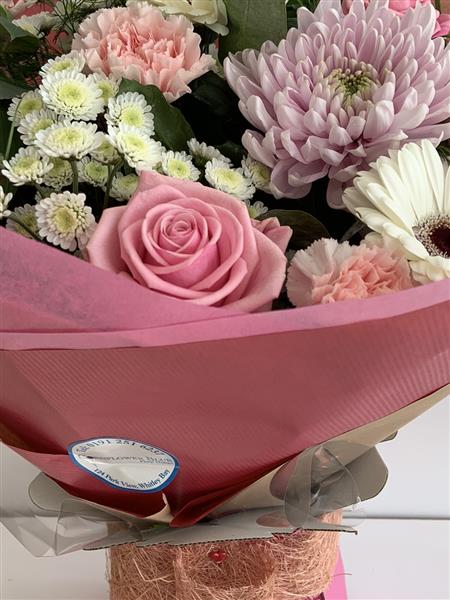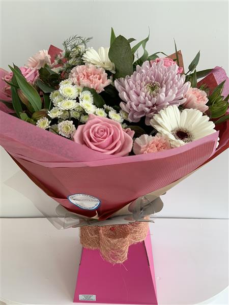 Pretty shades of pink with white. Wrapped in kraft paper and tissue and delivered in water. Flower mix may vary depending on the season, but will be in a pink and white colour scheme.