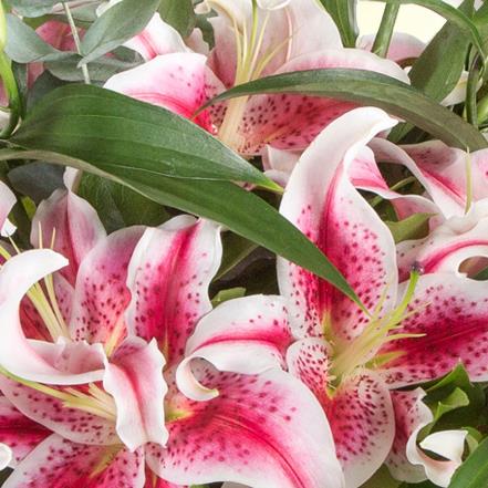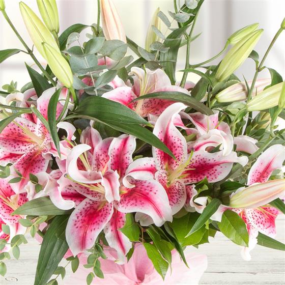 Pink oriental lilies combined with mixed greenery are all this bouquet needs to make a stunning display of highly perfumed blooms. LILIES WILL ARRIVE IN BUD. Image shown is when flowers are in full bloom.