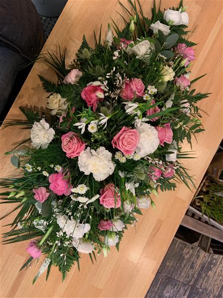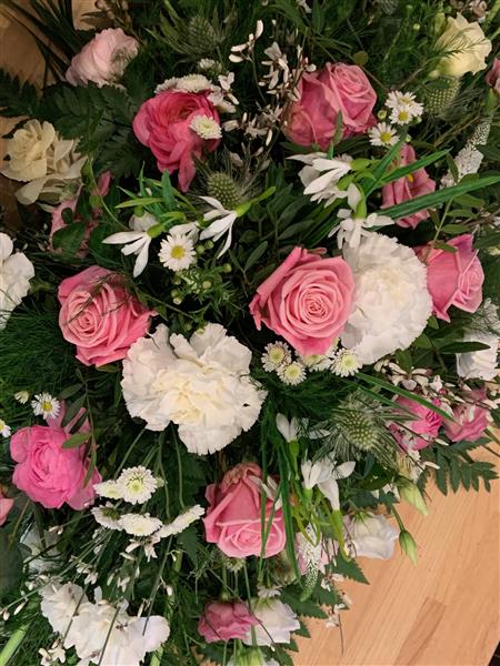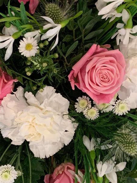 Double ended spray including pink roses, white carnations and Lisianthus.