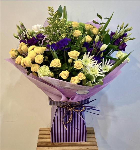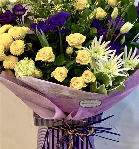 Complementary colours make up this hand tied bouquet. A mix of purple and yellow seasonal flowers will be chosen by one of our expert team of florists.