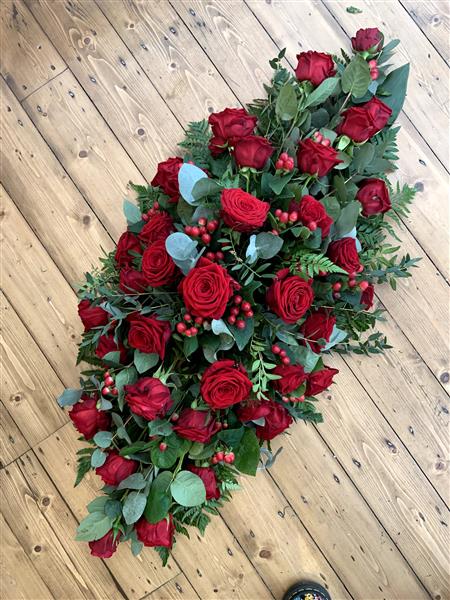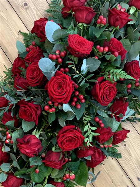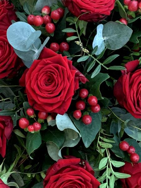 Double ended tribute in beautiful dark red rose with hypericum berries and eucalyptus