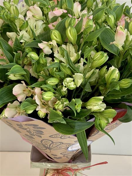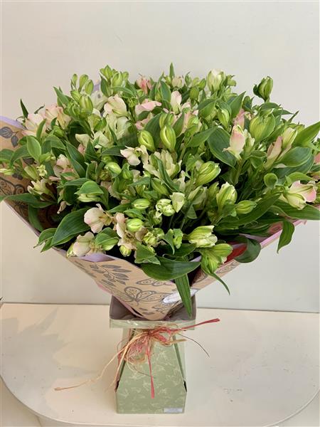 Simply alstroemerias hand tied and wrapped in kraft paper. Delivered in a stylish aqua box. Beautiful, long lasting choice. Colours may vary depending on availability.