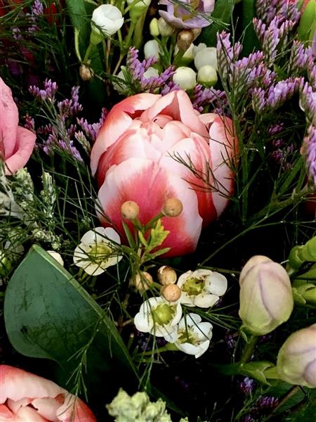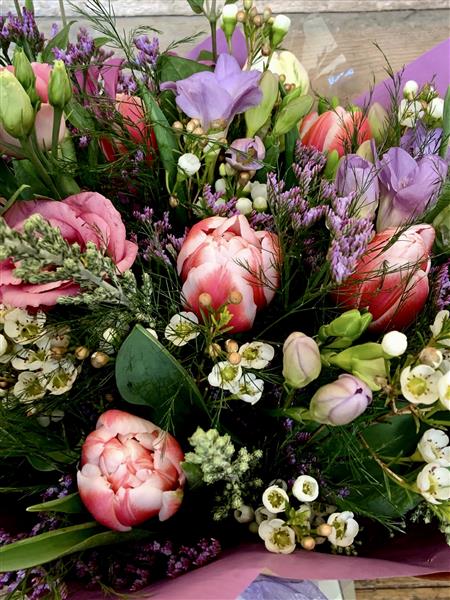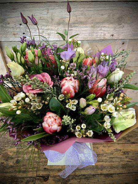 Aqua pack bouquet with mix of spring tulips, wax flower and lisianthus. Shades may vary depending on availability.