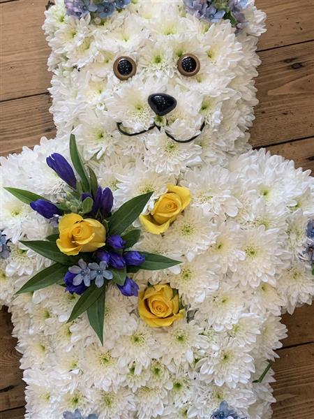 A small teddy bear tribute, measuring 19" (48cm) in height, available as pictured with a chrysanthemum base and complementing sprays in a range of delicate blue pastel shades.