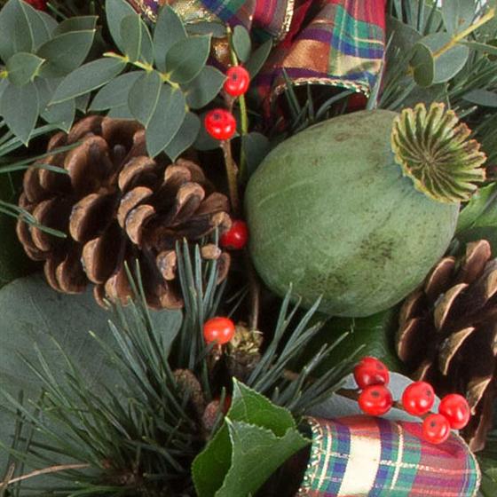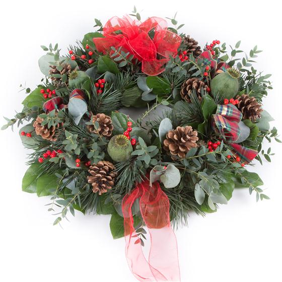 A 20” fresh spruce door wreath including eucalyptus, festive foliage, ribbon, cones and berries. A perfect, long lasting gift.