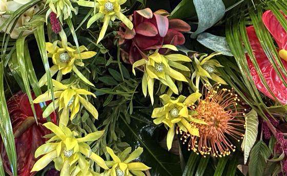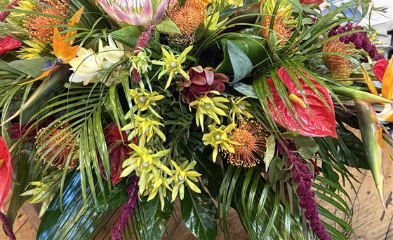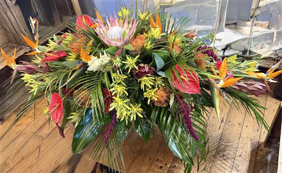 Large trailing coffin spray of mixed, vibrant tropical flowers. Including strelitzia (birds of paradise), protea and anthurium.