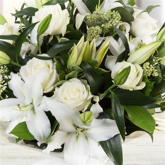 A fragrant hand-tied bouquet of white, oriental lilies, white roses mixed with eucalyptus.