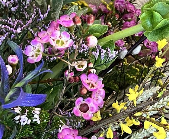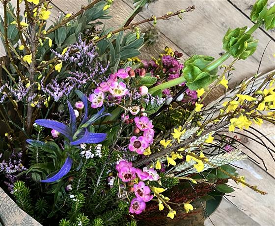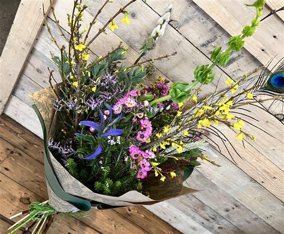 Wild and unstructured spring themed hand tied bouquet. Includes pussy willow, mixed seasonal foliage, forsythia and sprigs of dried wheat with a mix of the best choice on the day. Exact products may vary slightly depending on availability.