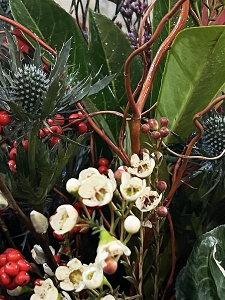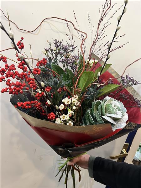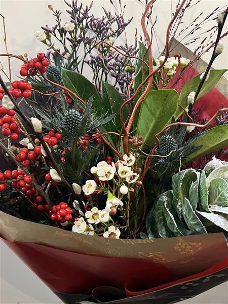 A wild and natural bunch with festive Ilex berry, pussy willow and eryngium thistle. Presented in kraft paper to complete the natural look.